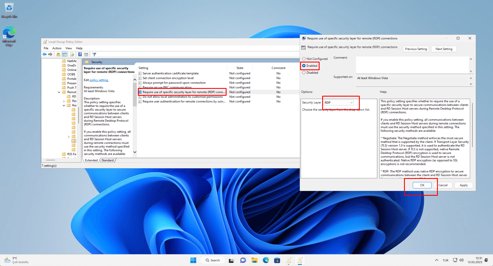 6. Çalıştır programını açıp veya ara çubuğundan gpedit.msc programını açıp sırasıyla Computer Configuration > Administrative Templates > Windows Components > Remote Desktop Services > Remote Desktop Session Host > Security alanına girip Require use of specific security layer for remote (RDP) connections ilkesini aktif edip RDP seçeneğini seçerek etkinleştiriyoruz.